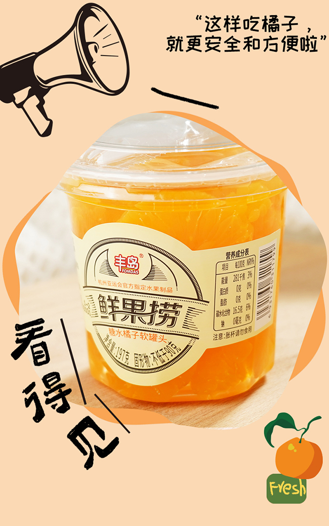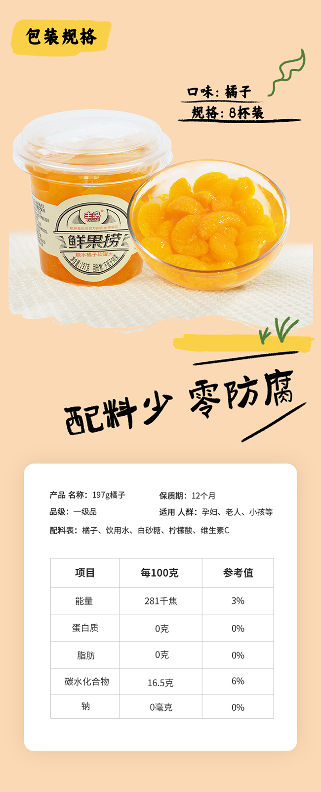 配料表: 桔子、水、白砂糖、食品添加劑(檸檬酸、維生素C) 儲藏方法: 常溫避光或冷藏 保質期: 12個月 凈含量: 197g 包裝方式: 散裝 品牌: 豐島 系列: 鮮果撈 種類: 水果罐頭 產地: 中國大陸 省份: 浙江省 城市: 紹興市